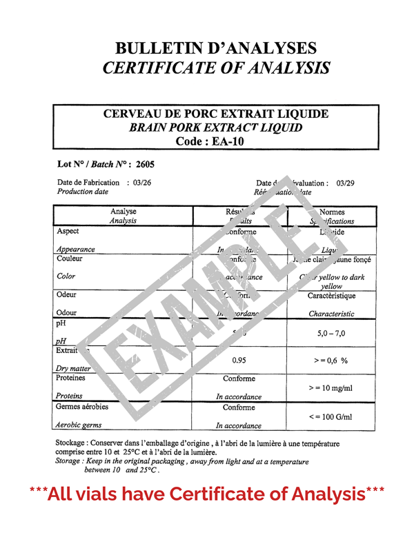 From every batch of one hundred vials processed, 3 vials are sent to an independent laboratory for testing for parasites, fungus, bacteria, viruses, and pyrogens. All vials are labeled in accordance with FDA dietary supplement requirements. These organ tissue extract products meet FDA standards and DSHEA guidelines for Dietary Supplements. Our laboratory uses organic embryo material, unlike other European countries that use juvenile material. Embryo material, which are in a differentiation phase, present fewer allergic risks and are more revitalizing due to their superior genetic material.